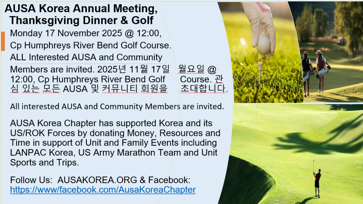 Members are invited. 2025년 11월 17일 월요일 @ 12:00, Cp Humphreys River Bend Golf Course. 관심 있는 모든 AUSA 및 커뮤니티 회원을 초대합니다.